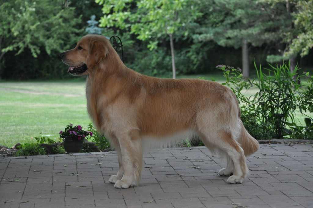 Mariner's lush, straight medium gold coat with blonde furnishings is a dream to groom. He is a moderate dog standing 23.5 inches and a rock hard 72 pounds. He has a solid topline with proper tail carriage straight off his back, and is well-balanced with clean movement and a beautiful sidegait that enables him to effortlessly float around the ring. Best of all, this boy has a very showy attitude and ring presence.